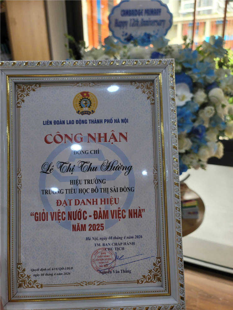 Trong niềm vui của những ngày tháng Tư đầy ý nghĩa, tập thể Trường Tiểu học Đô thị Sài Đồng trân trọng chúc mừng cô giáo Lê Thị Thu Hường - Bí thư Chi bộ, Hiệu trưởng nhà trường đã vinh dự được Liên đoàn Lao động thành phố Hà Nội công nhận danh hiệu “Giỏi việc nước - Đảm việc nhà” năm 2025.