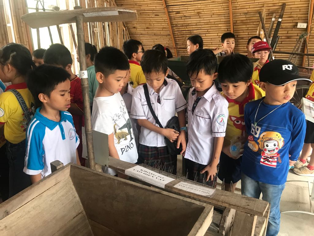 Ảnh 1: Các bạn nhỏ lớp 2A3 và 2A4 say sưa tìm hiểu về các loại máy phục vụ nông nghiệp.
